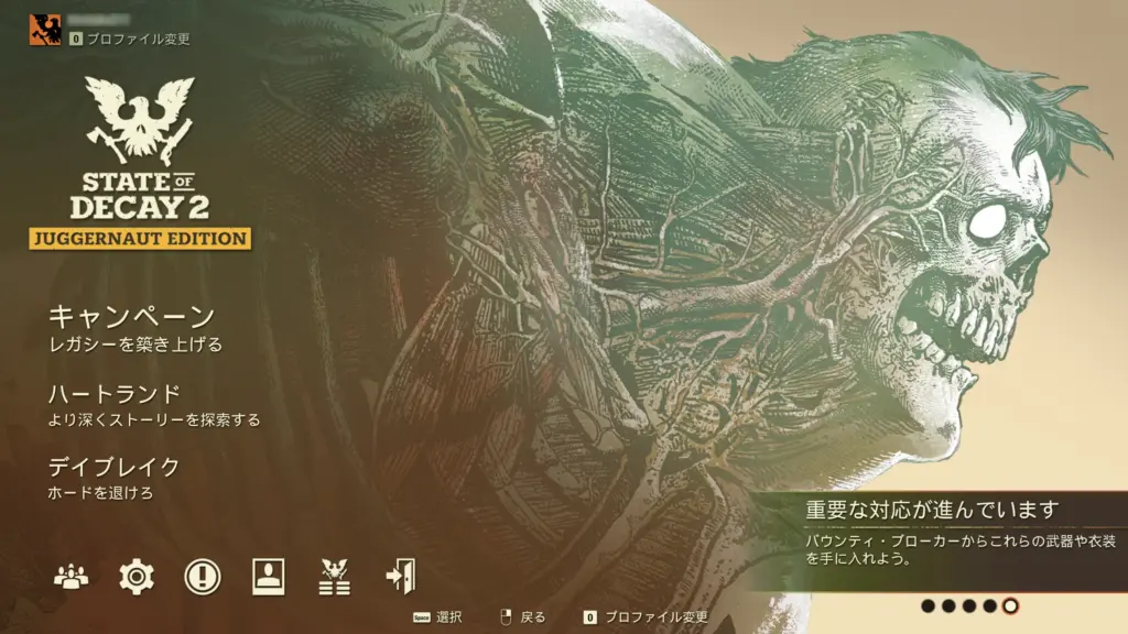 「日本語化が完了しました」と表示されたら、日本語化は完了です。State of Decay 2を起動してみましょう。日本語化されています。