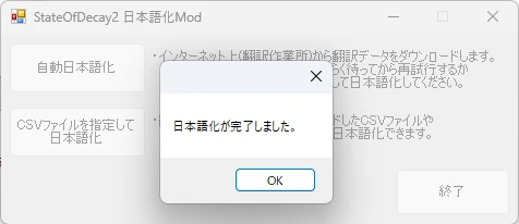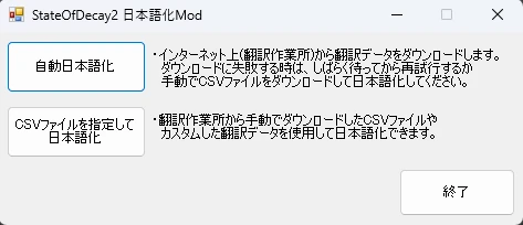 「StateOfDecay2 日本語化Mod」が起動します。「自動日本語化」ボタンをクリックします。