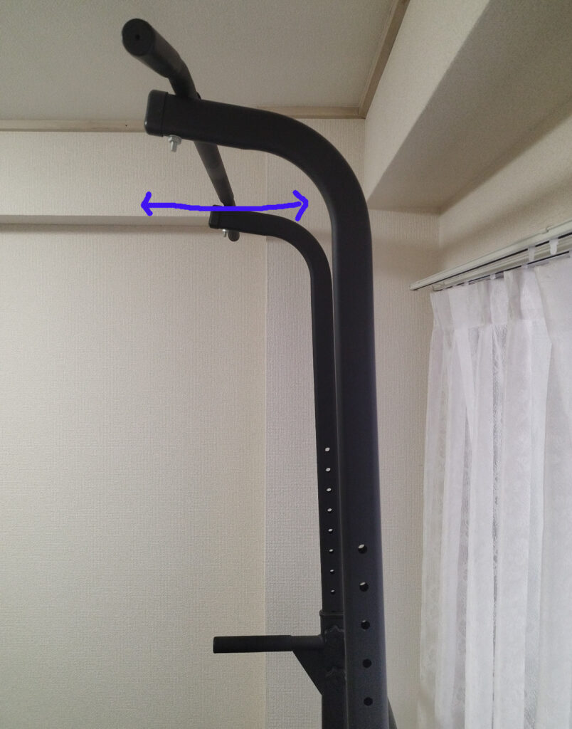 このフォームを行うためには、手を掛けるバーと支柱との間に十分なスペースが設けられたチンニングスタンドを選ぶことが重要です。以下の画像で示した青色のスペースが十分に設けられているかどうかを選ぶ基準の一つにしてください。